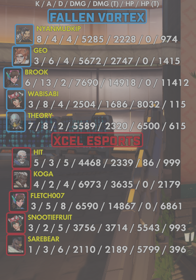10 entries| Team | Player | Kills | Assists | Deaths | Damage | Damage (Taken) | Healing | Healing (Taken) |