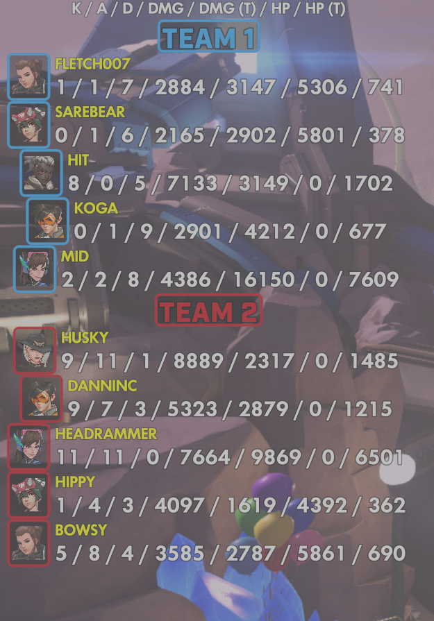 10 entries| Team | Player | Kills | Assists | Deaths | Damage | Damage (Taken) | Healing | Healing (Taken) |