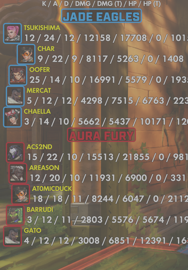 10 entries| Team | Player | Kills | Assists | Deaths | Damage | Damage (Taken) | Healing | Healing (Taken) |