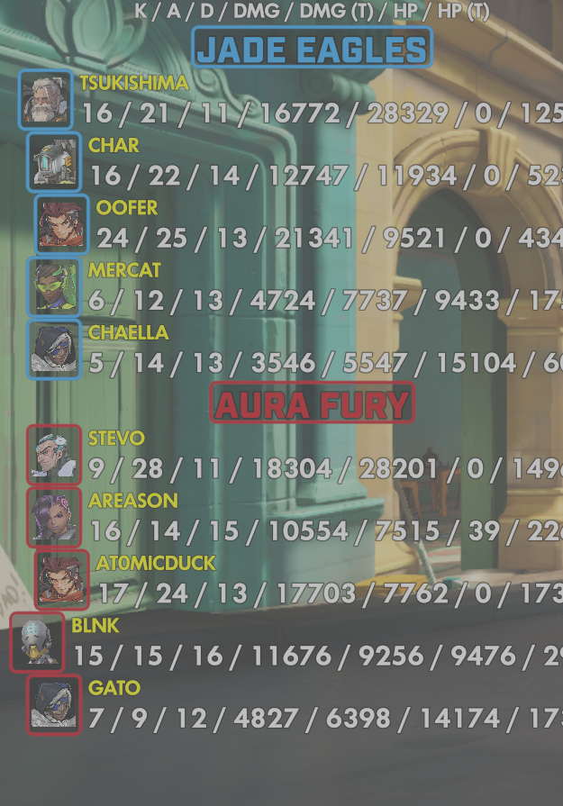 10 entries| Team | Player | Kills | Assists | Deaths | Damage | Damage (Taken) | Healing | Healing (Taken) |