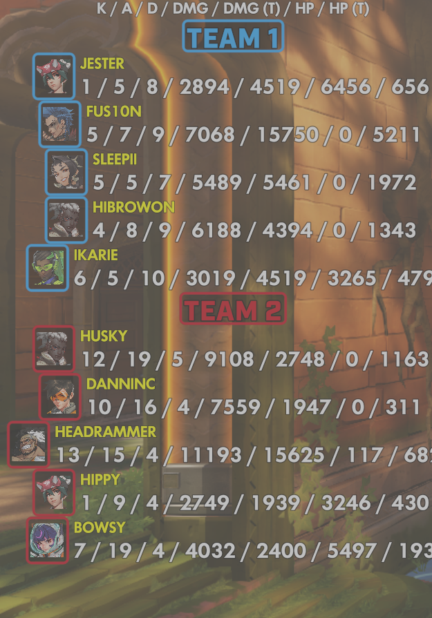 10 entries| Team | Player | Kills | Assists | Deaths | Damage | Damage (Taken) | Healing | Healing (Taken) |