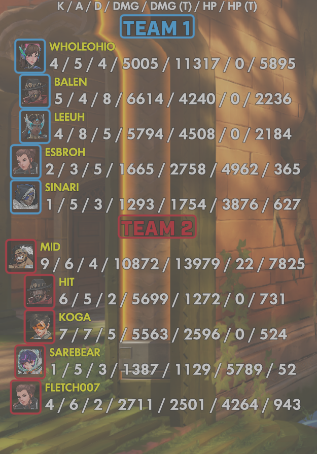 10 entries| Team | Player | Kills | Assists | Deaths | Damage | Damage (Taken) | Healing | Healing (Taken) |