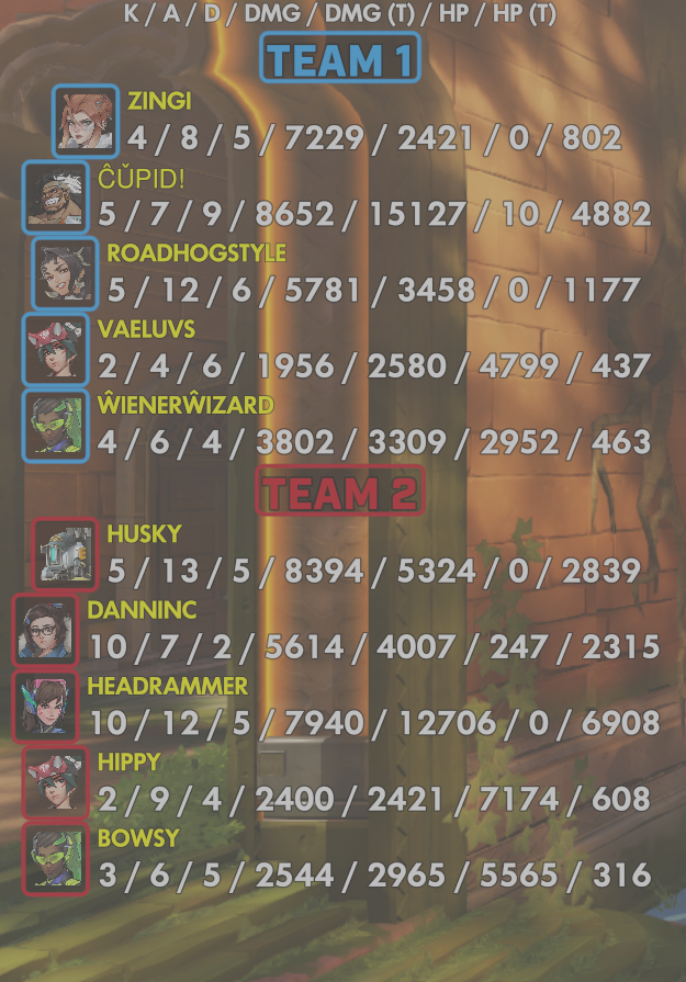 10 entries| Team | Player | Kills | Assists | Deaths | Damage | Damage (Taken) | Healing | Healing (Taken) |
