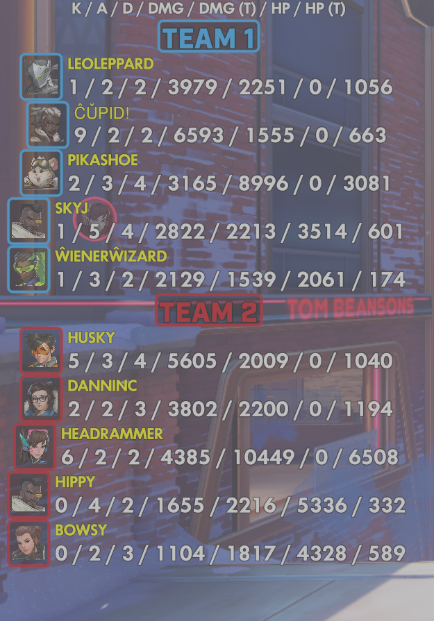 10 entries| Team | Player | Kills | Assists | Deaths | Damage | Damage (Taken) | Healing | Healing (Taken) |