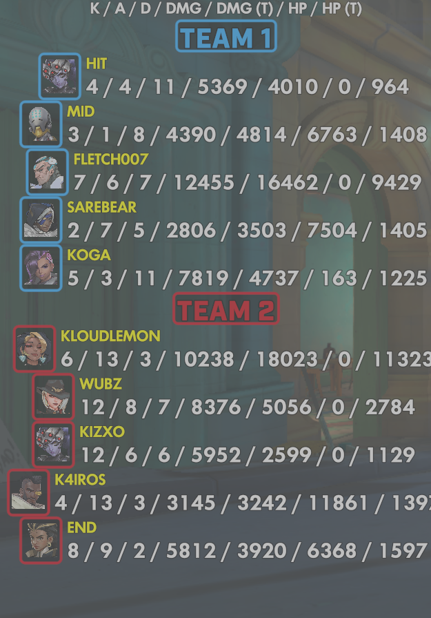 10 entries| Team | Player | Kills | Assists | Deaths | Damage | Damage (Taken) | Healing | Healing (Taken) |