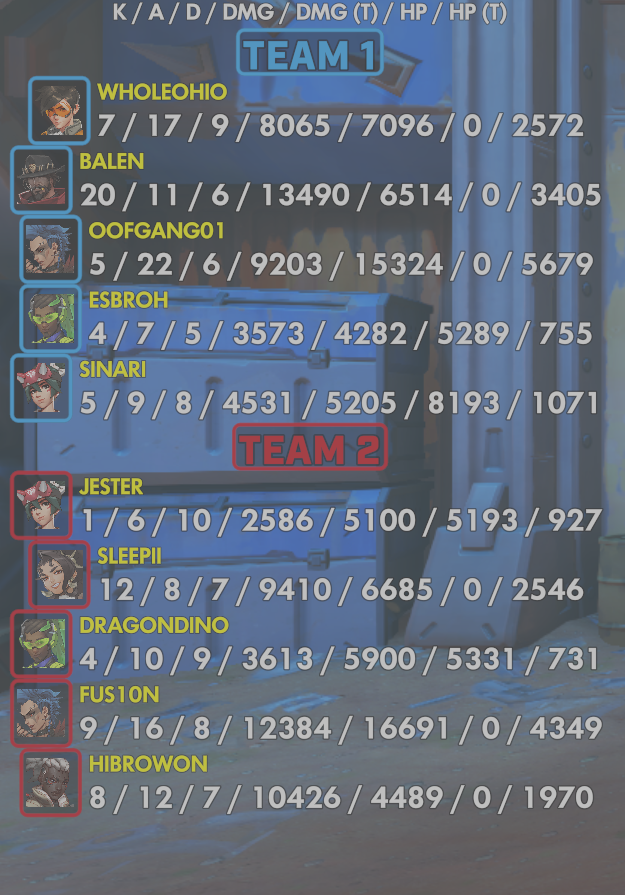 10 entries| Team | Player | Kills | Assists | Deaths | Damage | Damage (Taken) | Healing | Healing (Taken) |