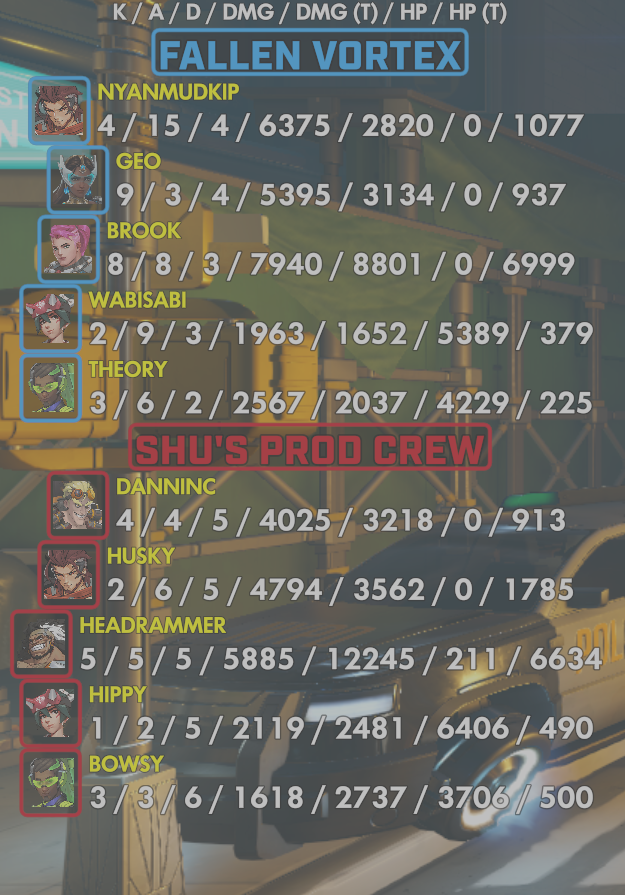 10 entries| Team | Player | Kills | Assists | Deaths | Damage | Damage (Taken) | Healing | Healing (Taken) |