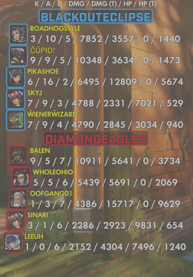 10 entries| Team | Player | Kills | Assists | Deaths | Damage | Damage (Taken) | Healing | Healing (Taken) |