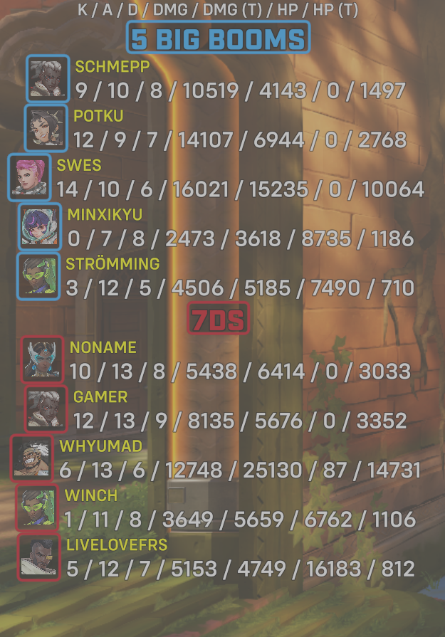 | Team | Player | Kills | Assists | Deaths | Damage | Damage (Taken) | Healing | Healing (Taken) |