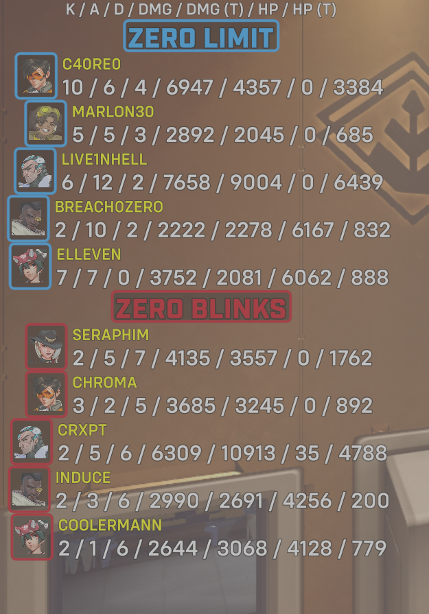 | Team | Player | Kills | Assists | Deaths | Damage | Damage (Taken) | Healing | Healing (Taken) |