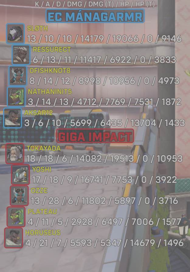 10 entries| Team | Player | Kills | Assists | Deaths | Damage | Damage (Taken) | Healing | Healing (Taken) |