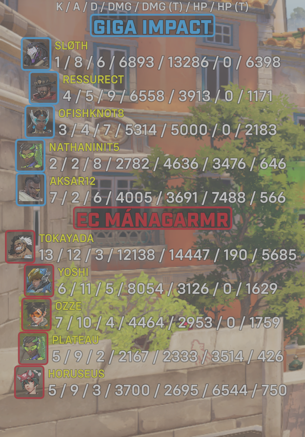 10 entries| Team | Player | Kills | Assists | Deaths | Damage | Damage (Taken) | Healing | Healing (Taken) |