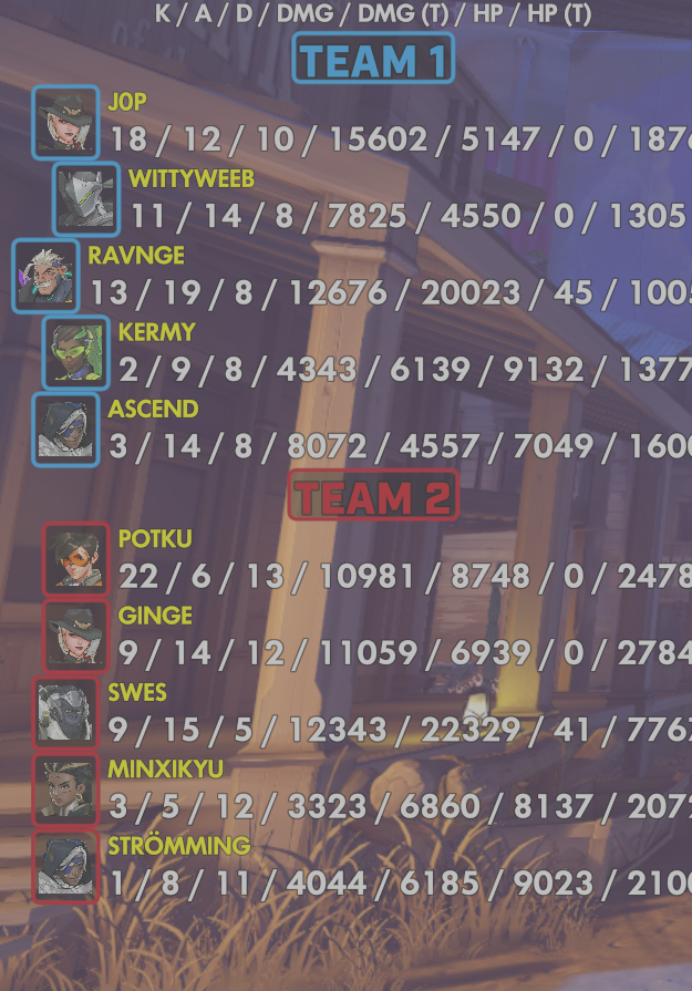 10 entries| Team | Player | Kills | Assists | Deaths | Damage | Damage (Taken) | Healing | Healing (Taken) |