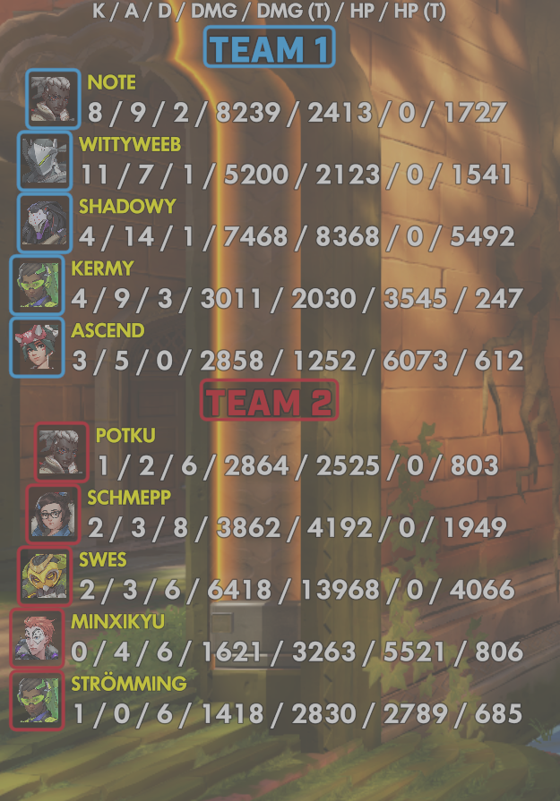 10 entries| Team | Player | Kills | Assists | Deaths | Damage | Damage (Taken) | Healing | Healing (Taken) |