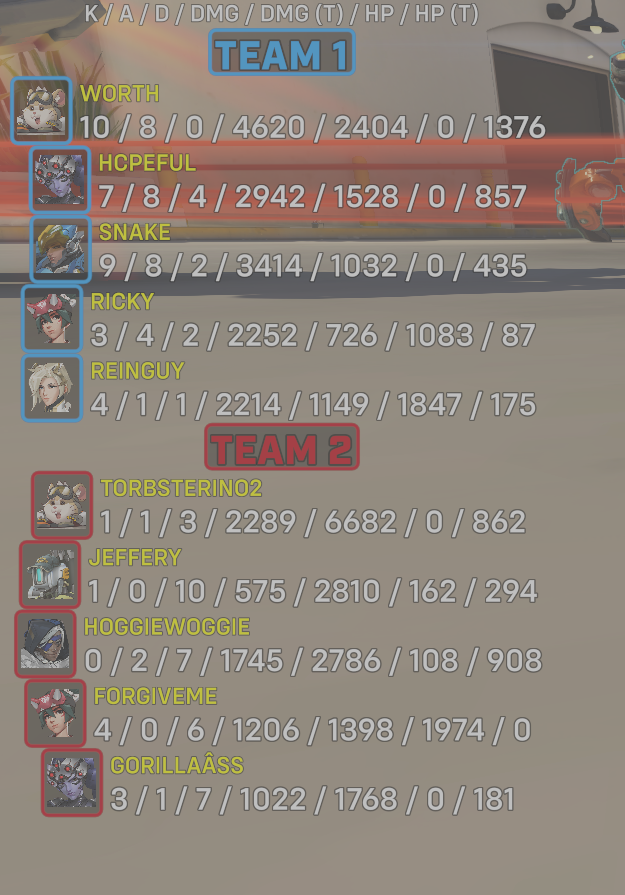 10 entries| Team | Player | Kills | Assists | Deaths | Damage | Damage (Taken) | Healing | Healing (Taken) |