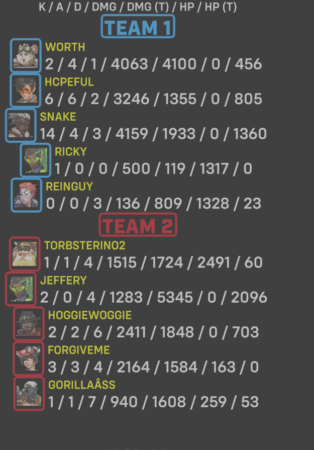 10 entries| Team | Player | Kills | Assists | Deaths | Damage | Damage (Taken) | Healing | Healing (Taken) |