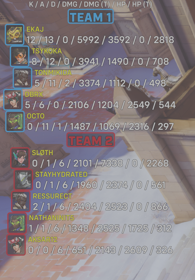 10 entries| Team | Player | Kills | Assists | Deaths | Damage | Damage (Taken) | Healing | Healing (Taken) |