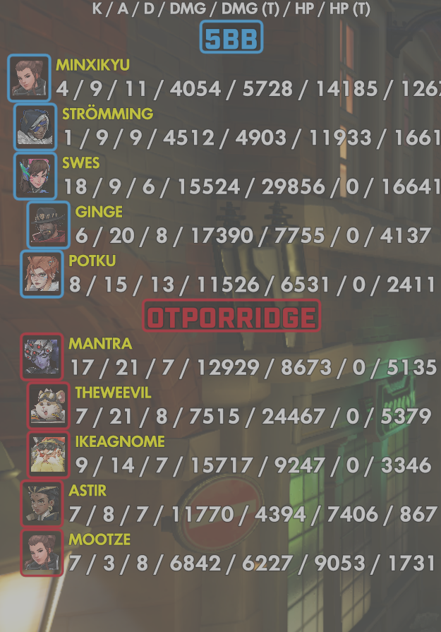 10 entries| Team | Player | Kills | Assists | Deaths | Damage | Damage (Taken) | Healing | Healing (Taken) |