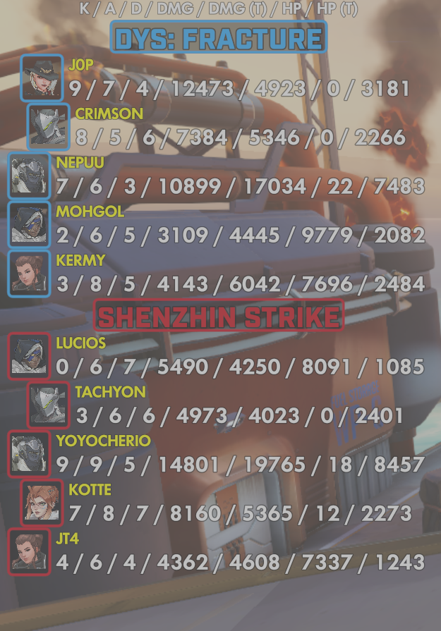 10 entries| Team | Player | Kills | Assists | Deaths | Damage | Damage (Taken) | Healing | Healing (Taken) |