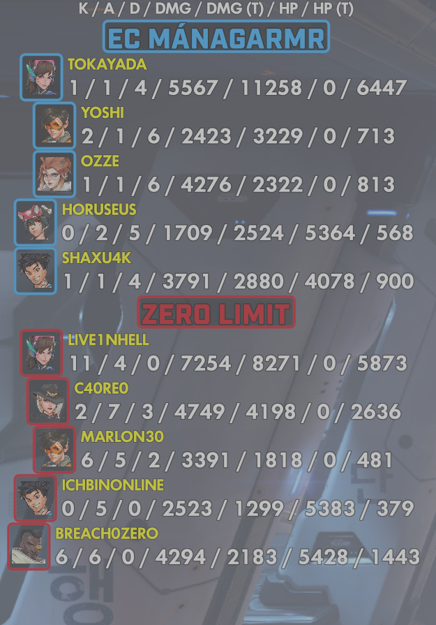 | Team | Player | Kills | Assists | Deaths | Damage | Damage (Taken) | Healing | Healing (Taken) |