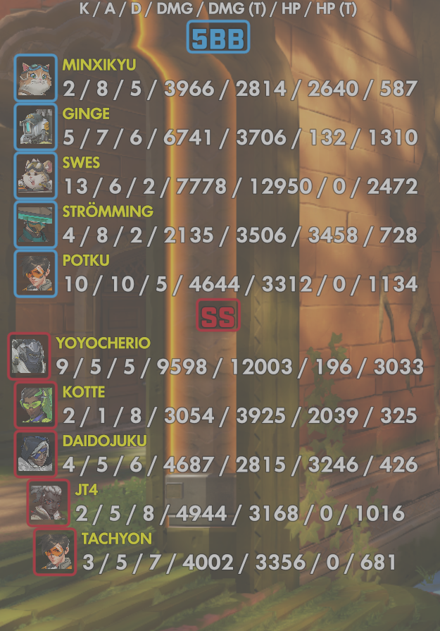 10 entries| Team | Player | Kills | Assists | Deaths | Damage | Damage (Taken) | Healing | Healing (Taken) |