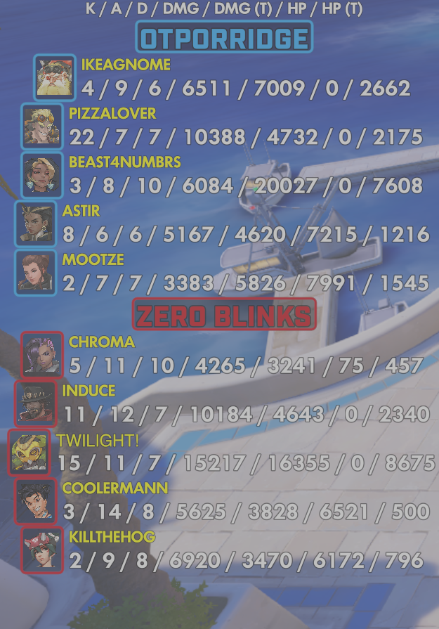 10 entries| Team | Player | Kills | Assists | Deaths | Damage | Damage (Taken) | Healing | Healing (Taken) |