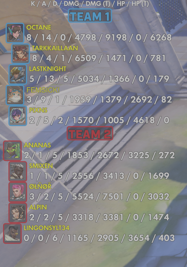 10 entries| Team | Player | Kills | Assists | Deaths | Damage | Damage (Taken) | Healing | Healing (Taken) |