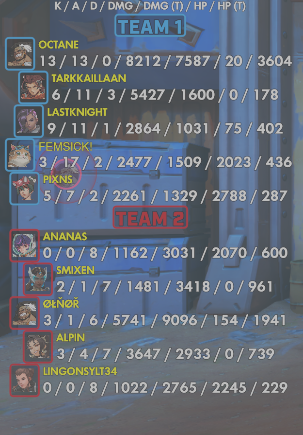 10 entries| Team | Player | Kills | Assists | Deaths | Damage | Damage (Taken) | Healing | Healing (Taken) |