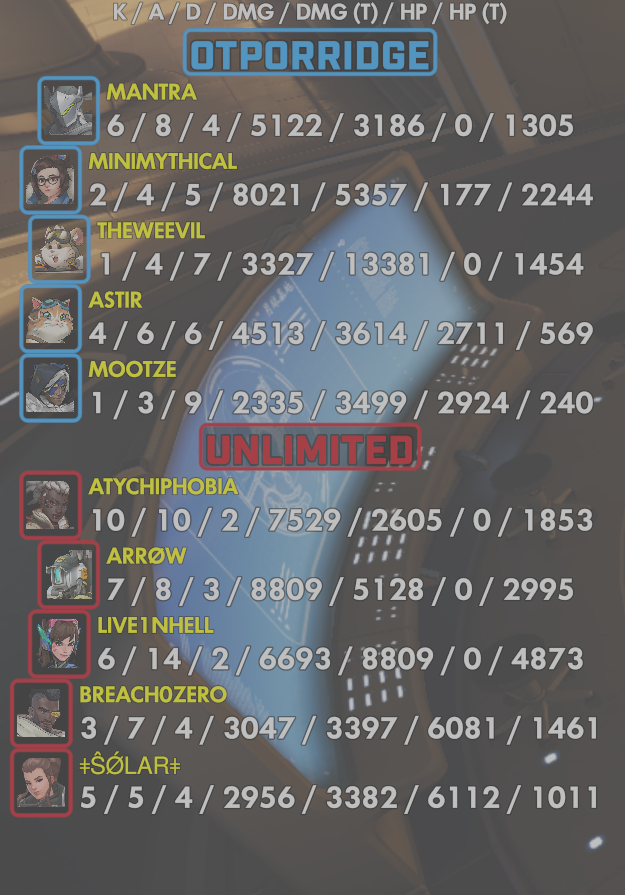 10 entries| Team | Player | Kills | Assists | Deaths | Damage | Damage (Taken) | Healing | Healing (Taken) |