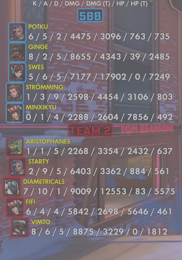 10 entries| Team | Player | Kills | Assists | Deaths | Damage | Damage (Taken) | Healing | Healing (Taken) |