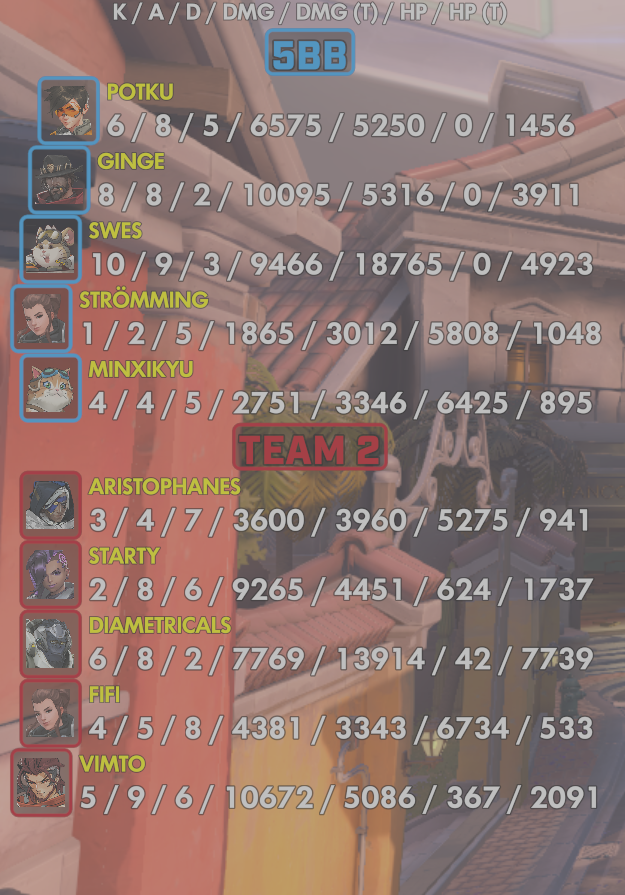 9 entries| Team | Player | Kills | Assists | Deaths | Damage | Damage (Taken) | Healing | Healing (Taken) |