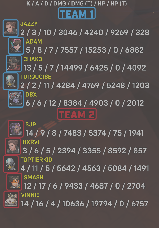10 entries| Team | Player | Kills | Assists | Deaths | Damage | Damage (Taken) | Healing | Healing (Taken) |