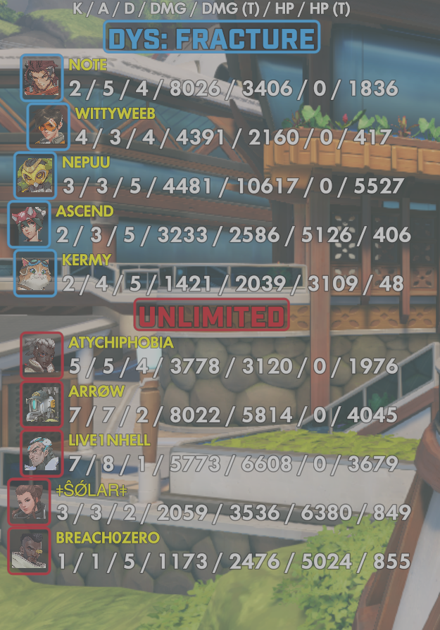 10 entries| Team | Player | Kills | Assists | Deaths | Damage | Damage (Taken) | Healing | Healing (Taken) |