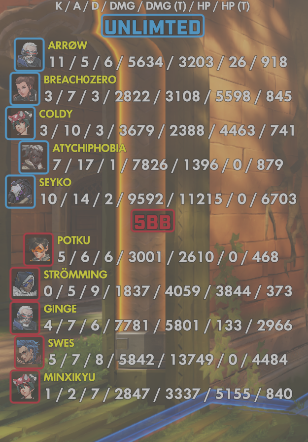 10 entries| Team | Player | Kills | Assists | Deaths | Damage | Damage (Taken) | Healing | Healing (Taken) |
