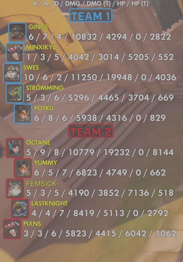 10 entries| Team | Player | Kills | Assists | Deaths | Damage | Damage (Taken) | Healing | Healing (Taken) |