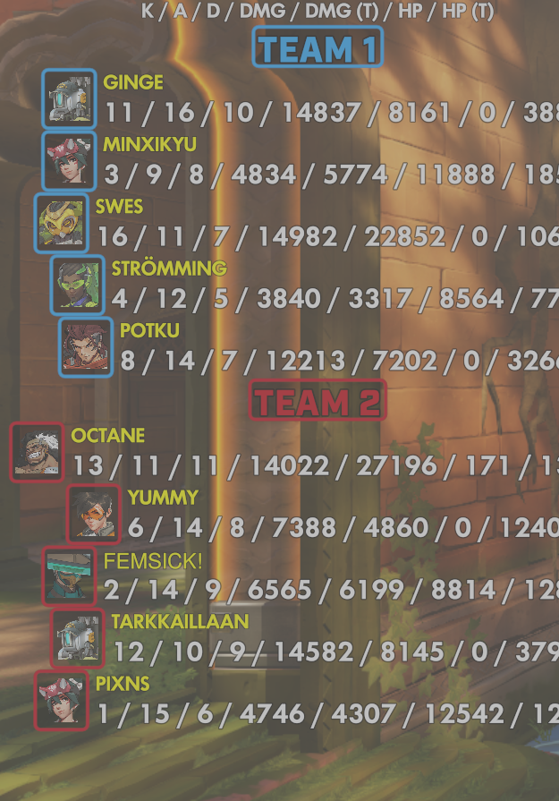10 entries| Team | Player | Kills | Assists | Deaths | Damage | Damage (Taken) | Healing | Healing (Taken) |