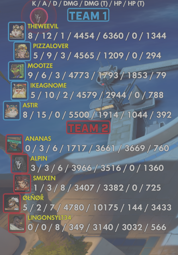10 entries| Team | Player | Kills | Assists | Deaths | Damage | Damage (Taken) | Healing | Healing (Taken) |