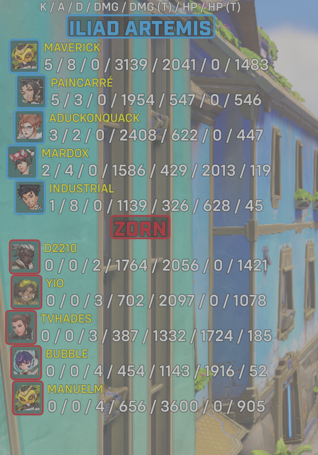 | Team | Player | Kills | Assists | Deaths | Damage | Damage (Taken) | Healing | Healing (Taken) |