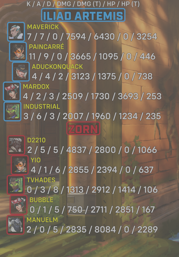 | Team | Player | Kills | Assists | Deaths | Damage | Damage (Taken) | Healing | Healing (Taken) |