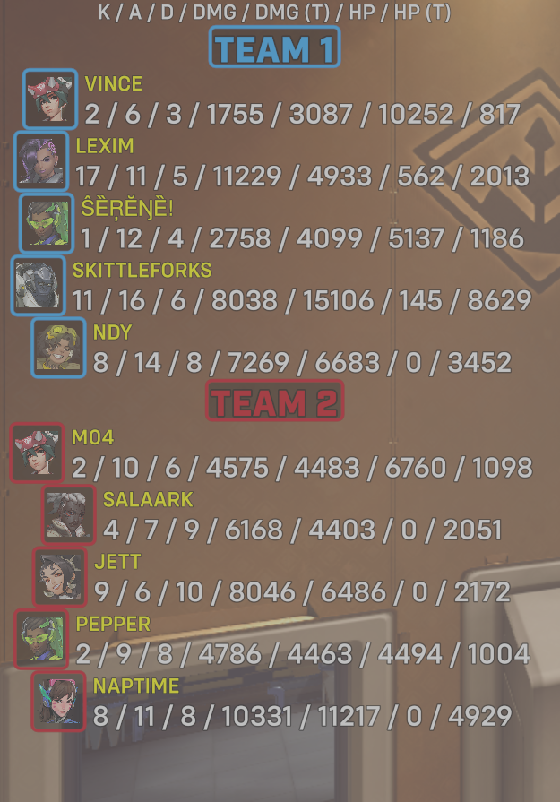 | Team | Player | Kills | Assists | Deaths | Damage | Damage (Taken) | Healing | Healing (Taken) |