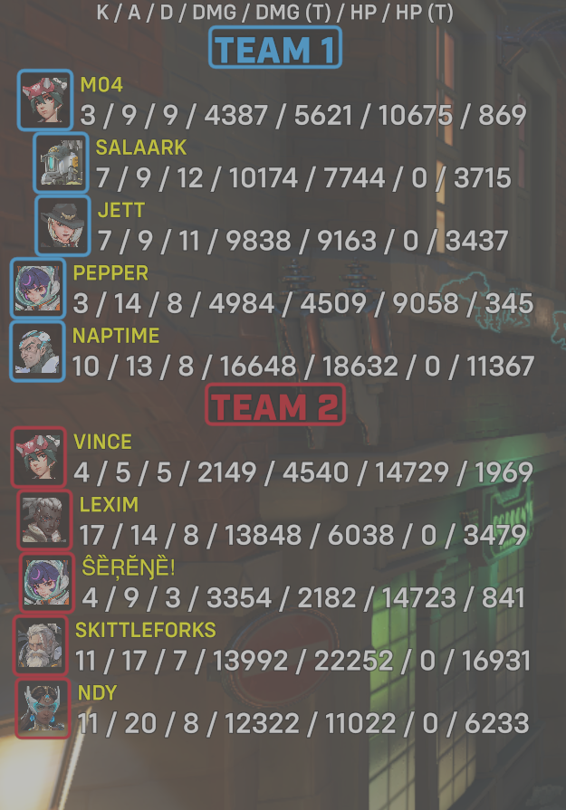 | Team | Player | Kills | Assists | Deaths | Damage | Damage (Taken) | Healing | Healing (Taken) |