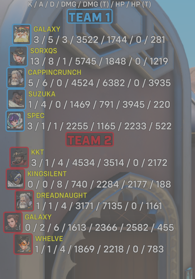 10 entries| Team | Player | Kills | Assists | Deaths | Damage | Damage (Taken) | Healing | Healing (Taken) |