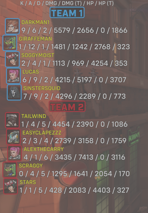 | Team | Player | Kills | Assists | Deaths | Damage | Damage (Taken) | Healing | Healing (Taken) |