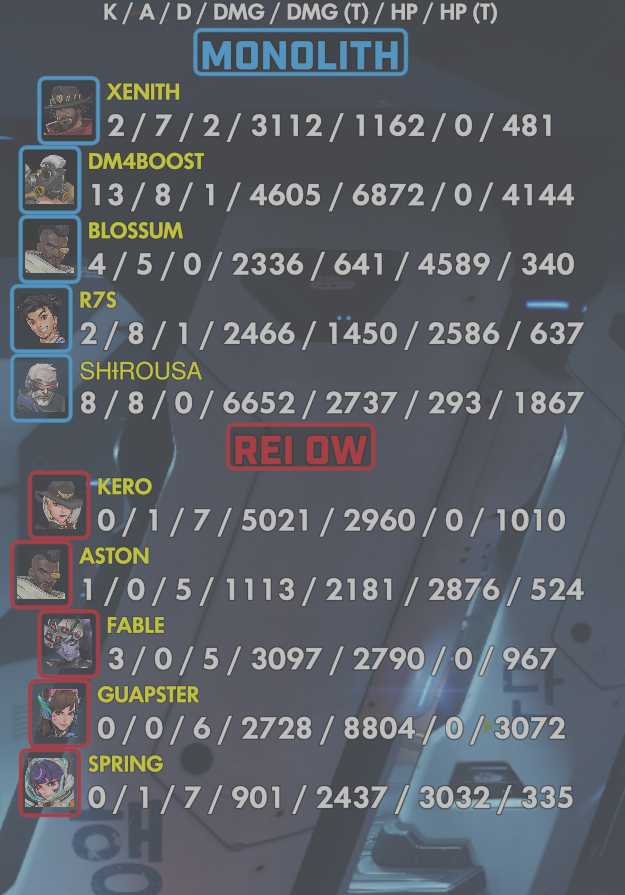 10 entries| Team | Player | Kills | Assists | Deaths | Damage | Damage (Taken) | Healing | Healing (Taken) |