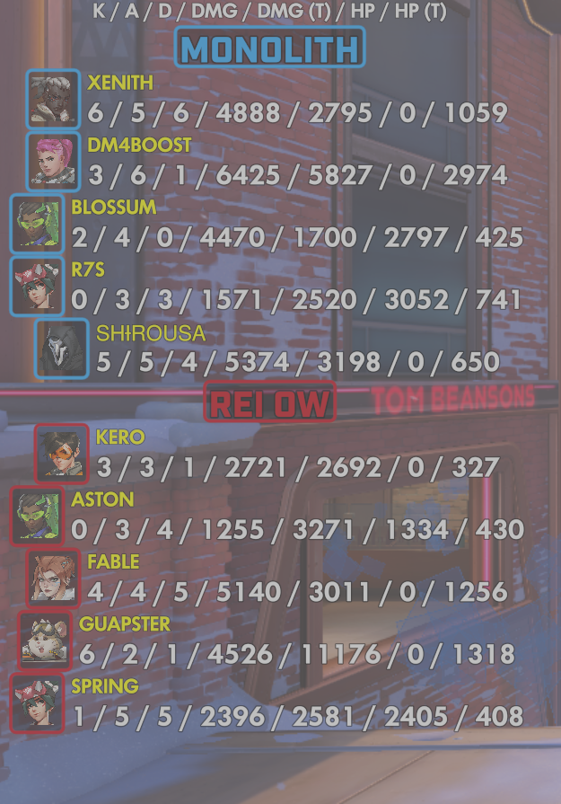10 entries| Team | Player | Kills | Assists | Deaths | Damage | Damage (Taken) | Healing | Healing (Taken) |