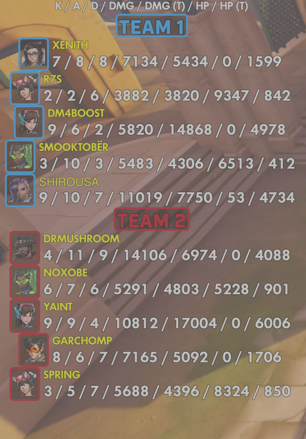 10 entries| Team | Player | Kills | Assists | Deaths | Damage | Damage (Taken) | Healing | Healing (Taken) |