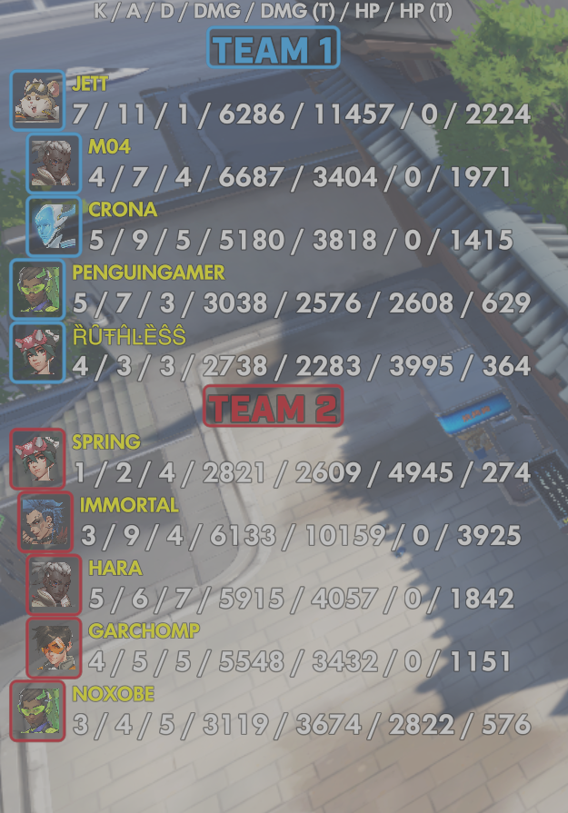 10 entries| Team | Player | Kills | Assists | Deaths | Damage | Damage (Taken) | Healing | Healing (Taken) |