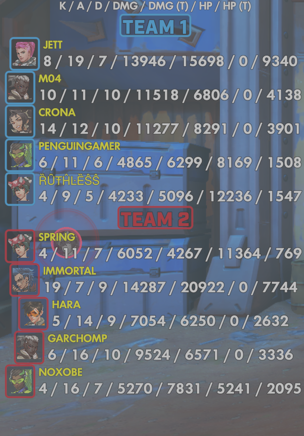 10 entries| Team | Player | Kills | Assists | Deaths | Damage | Damage (Taken) | Healing | Healing (Taken) |