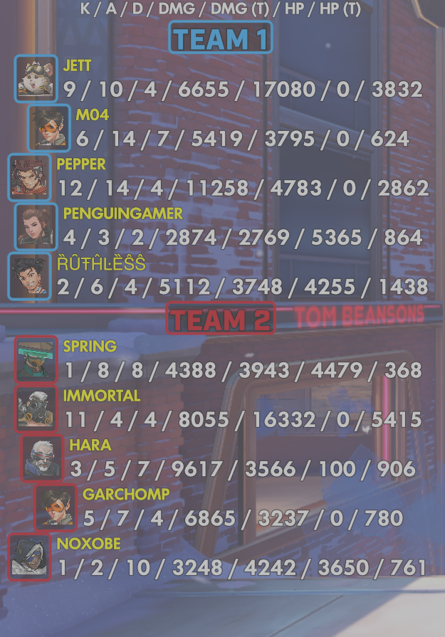 10 entries| Team | Player | Kills | Assists | Deaths | Damage | Damage (Taken) | Healing | Healing (Taken) |