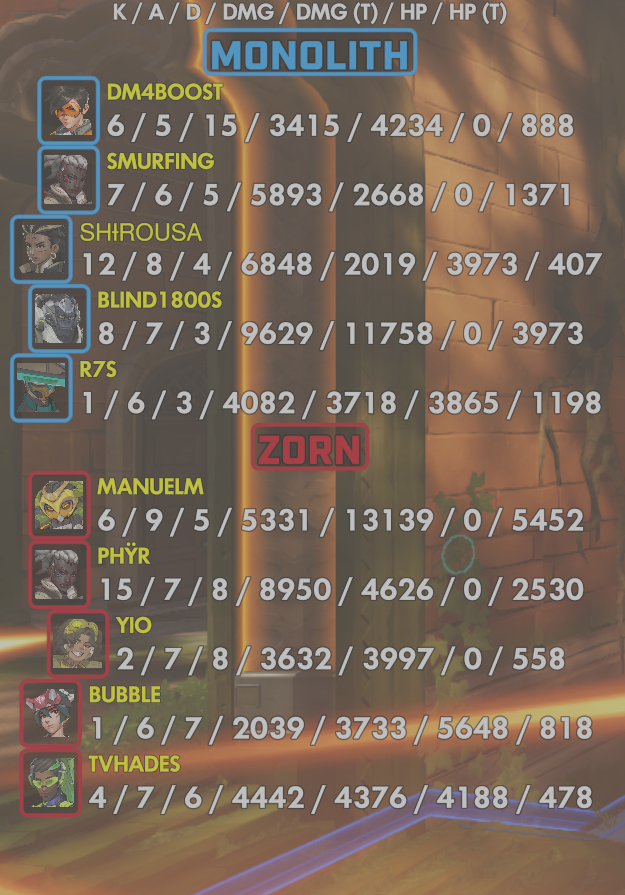 10 entries| Team | Player | Kills | Assists | Deaths | Damage | Damage (Taken) | Healing | Healing (Taken) |